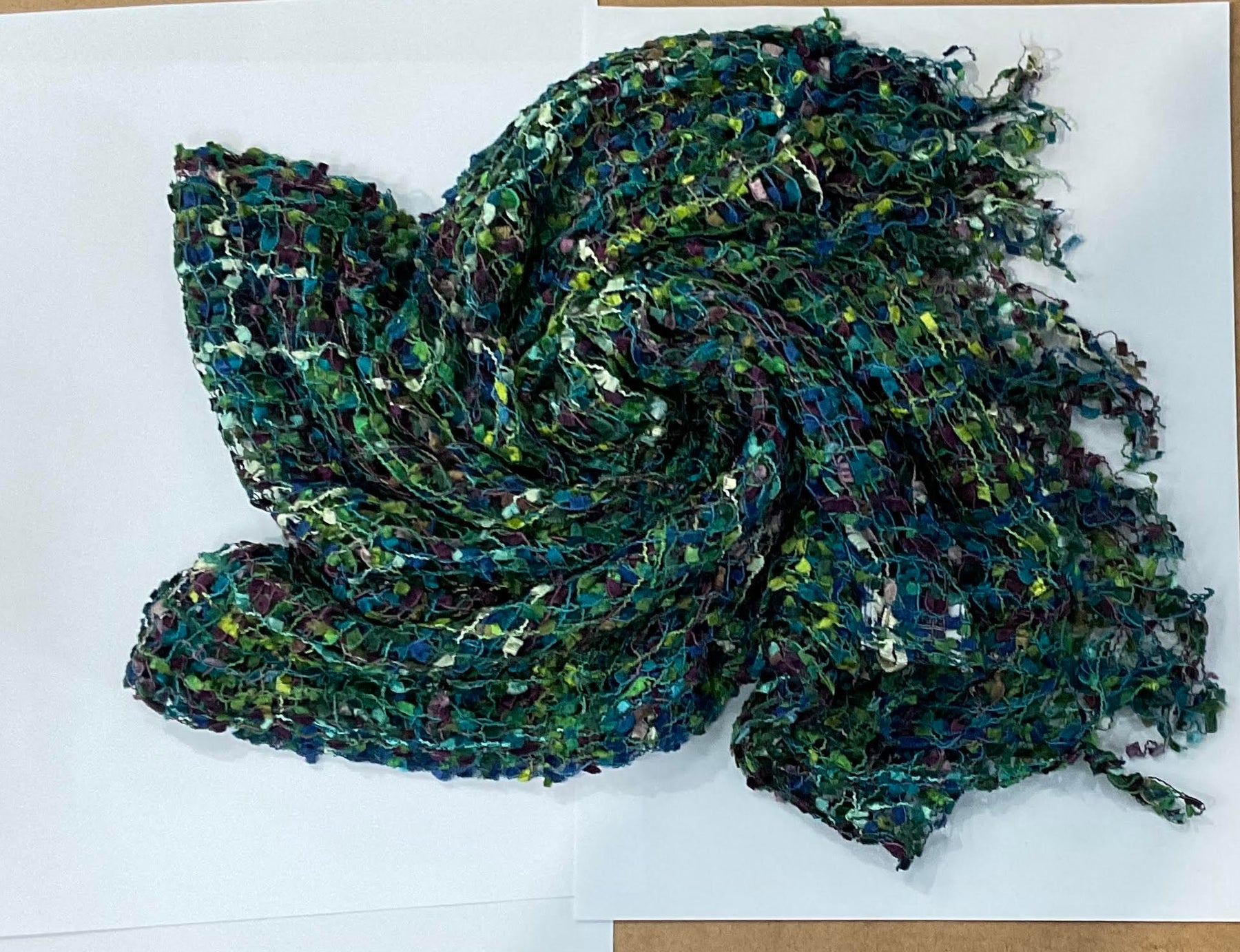 Ethically sourced scarf, viscose scarf, blue scarf, green scarf, multi colour scarf, open weave scarf, tassel scarf, lightweight scarf, fashion accessory, sustainable fashion.